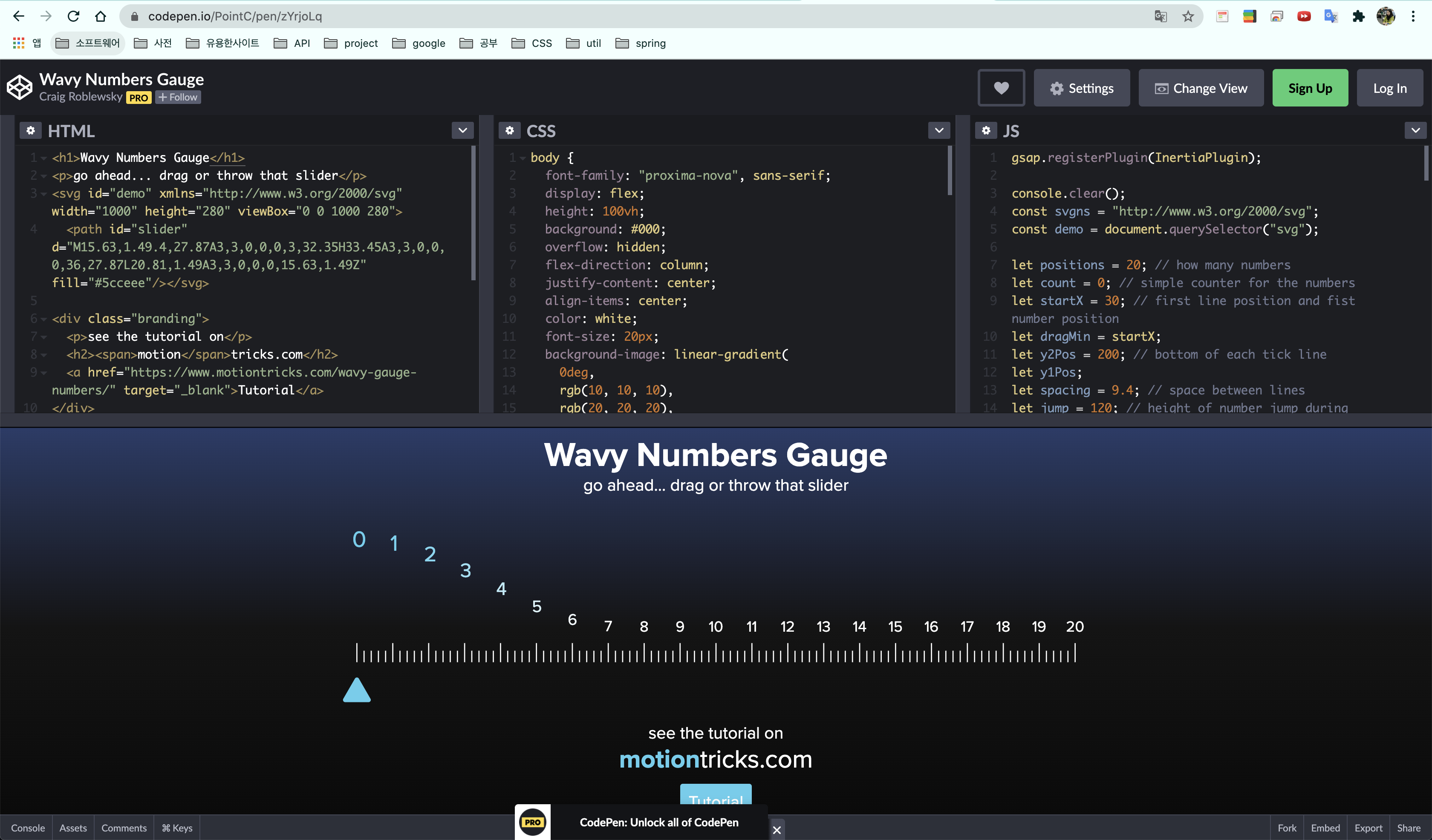 아래는 코드펜 사이트에 있는 한 소스입니다. 아래처럼 HTML, CSS, JS의 코드를 확인할 수 있고 아래에 미리보기 화면을 제공합니다.