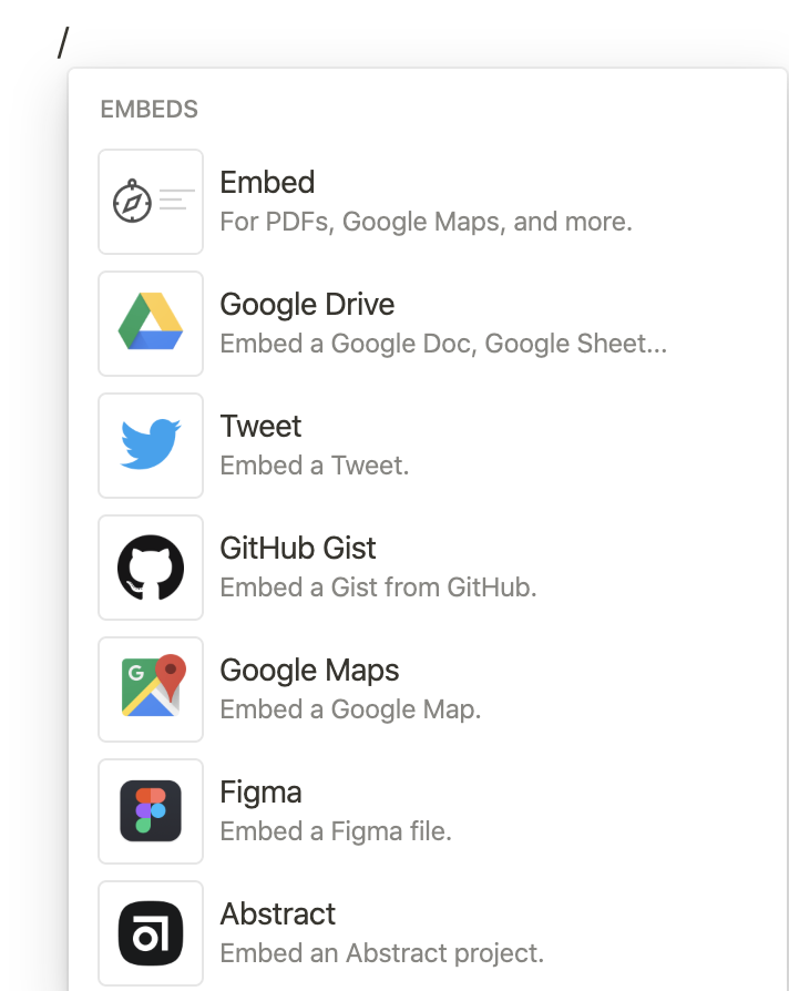 사실.. 이렇게 나눠져 있기는 하지만 맨 처음 1. Embed 를 통해 url을 첨부하면 위 내용들처럼 미리보기를 제공합니다. 그렇기 때문에 일부러 어떤 Embeds를 사용할지 지정해서 첨부할 필요는 없지만, 이렇게 표시해줌으로써 어떤 프로그램들을 미리볼 수 있는지 알 수 있어서 좋네요.