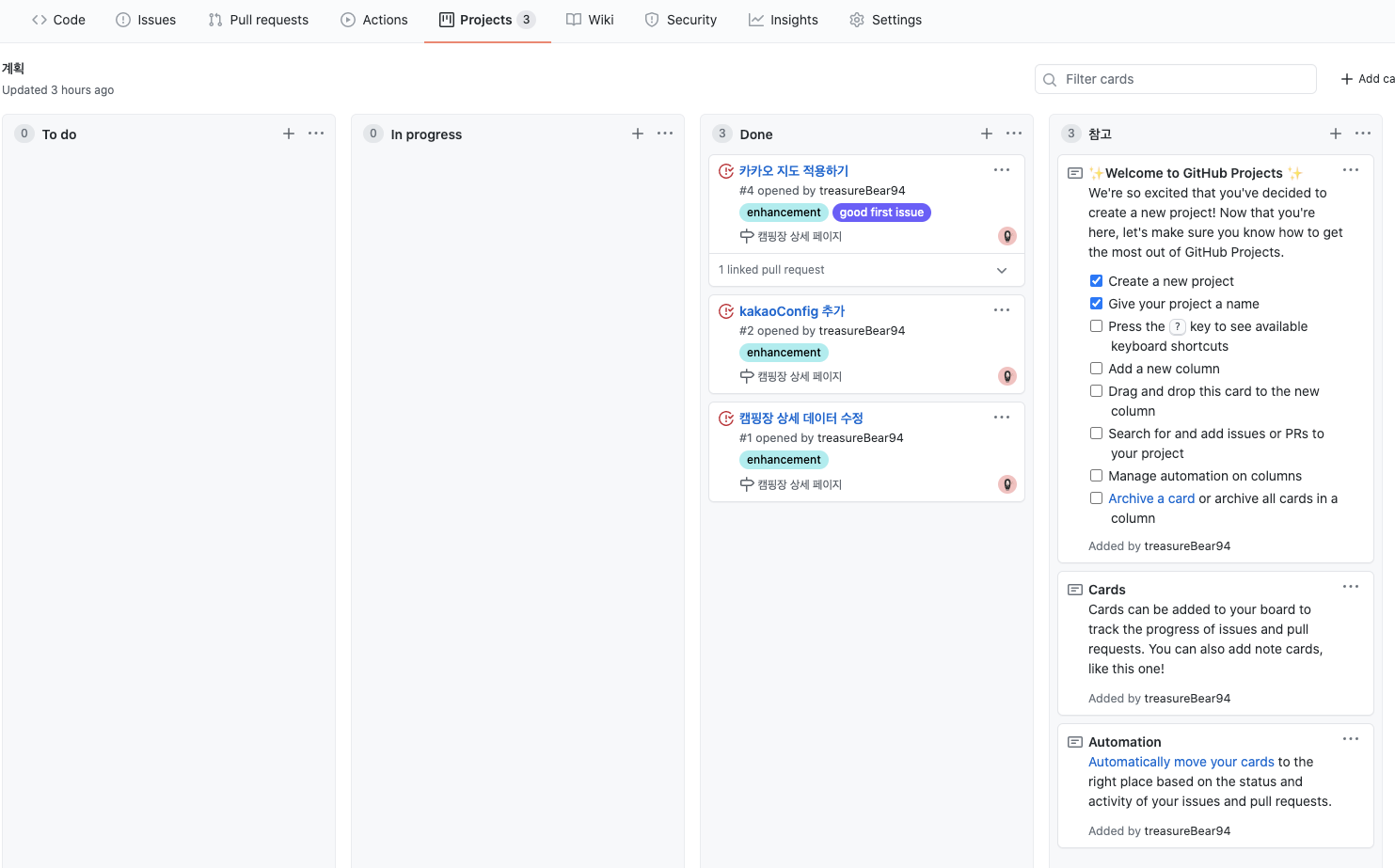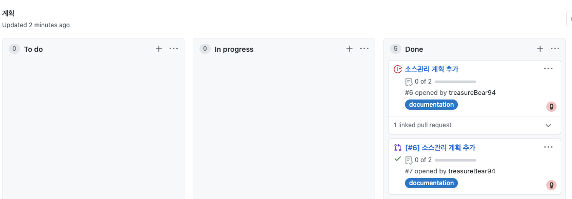 Automated kanban은 이슈가 open, close 로 상태가 변화할 때 자동으로 To do, Done으로 옮겨줍니다.