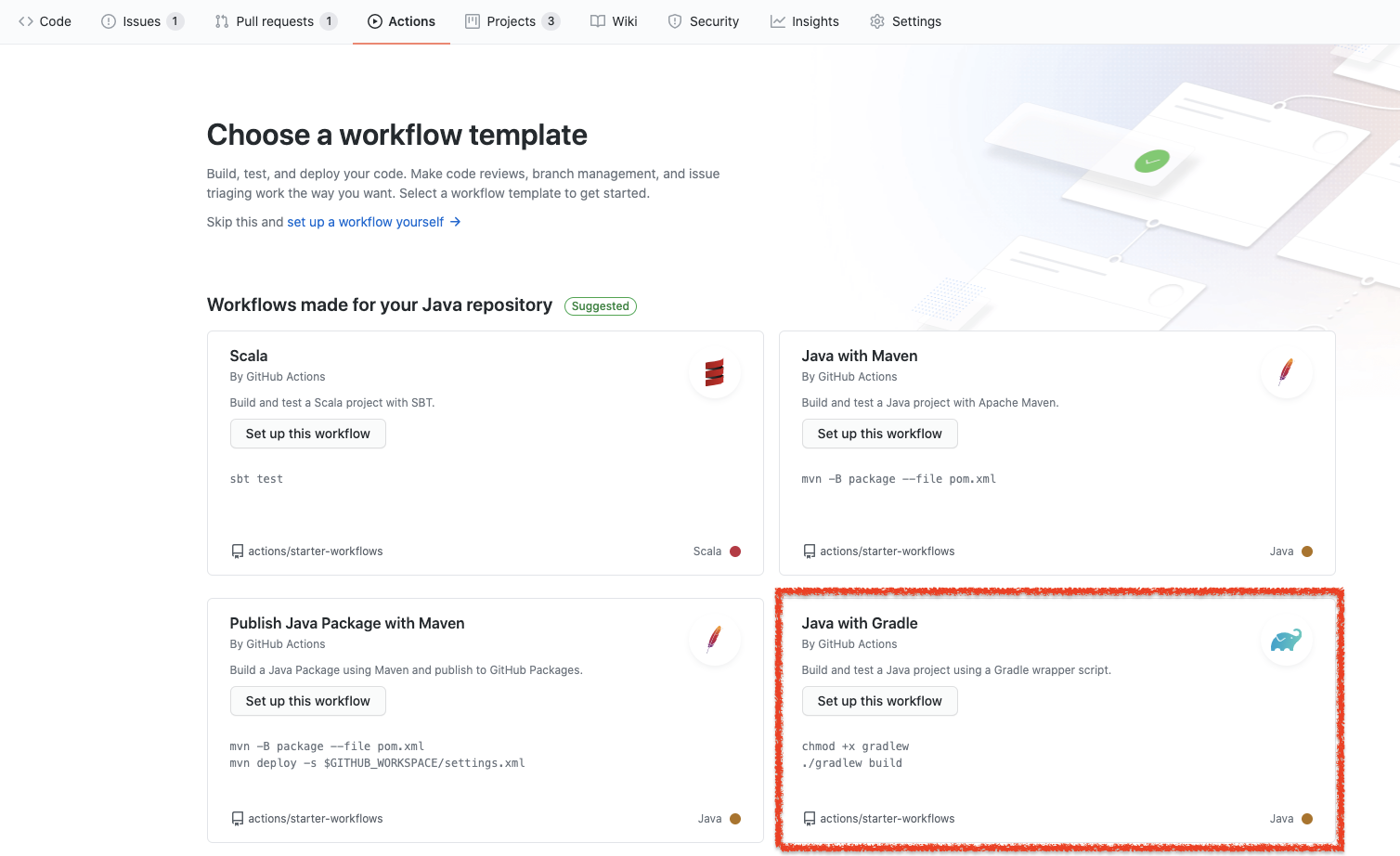 직접 만들 수도 있고, 이미 만들어진 내용을 가져다가 쓸 수 있습니다. 제 프로젝트는 Gradle을 기반한 Java 이기 때문에 해당 내용을 클릭합니다.