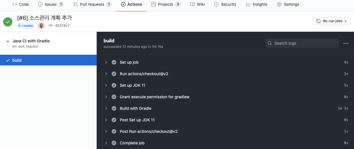 그러면 Actions 탭을 통해 build 내용을 확인 할 수 있고, Workflow 파일도 수정할 수 있습니다.
