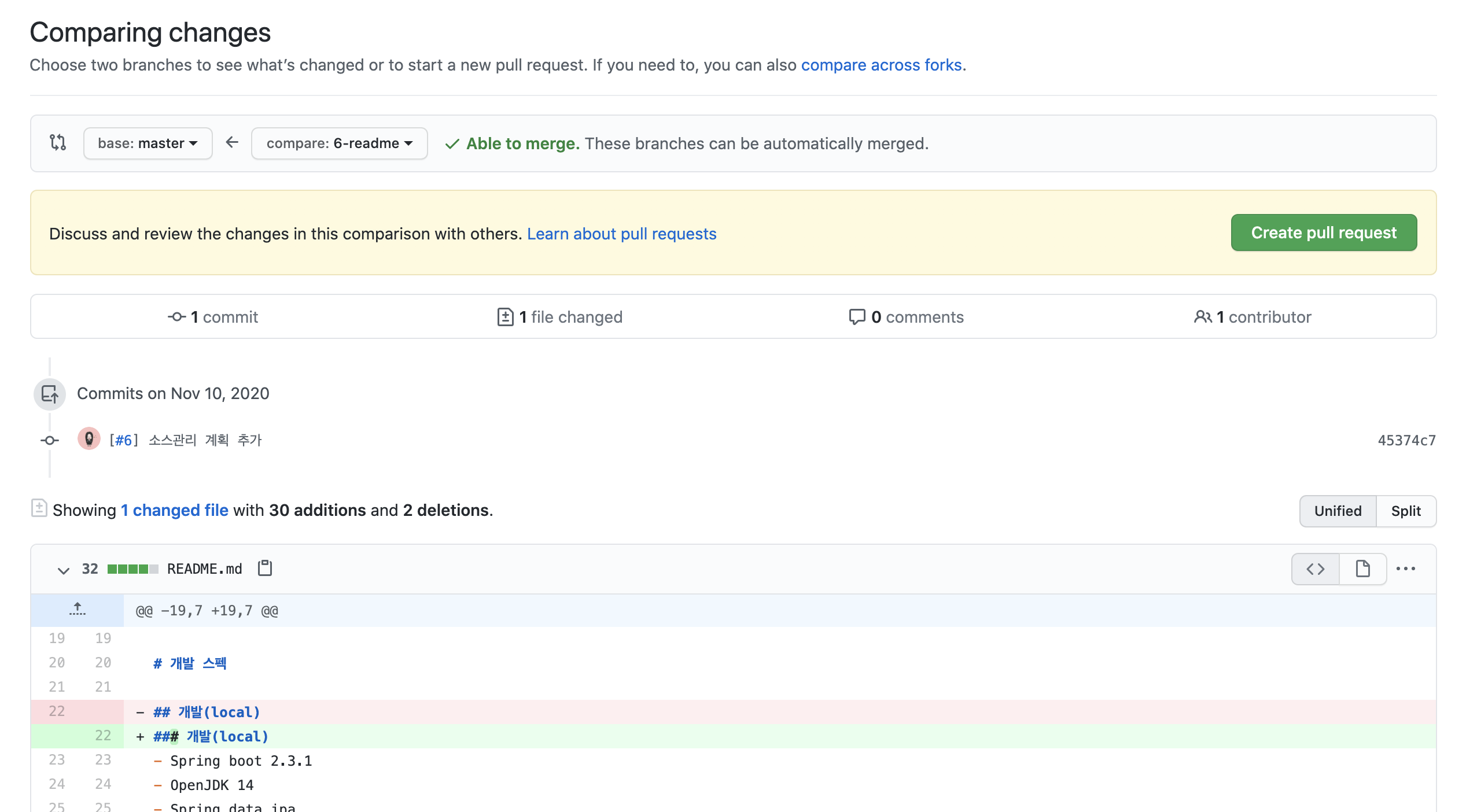 머지가 가능하다고도 뜨네요. [ Create pull request ] 를 눌러줍니다.