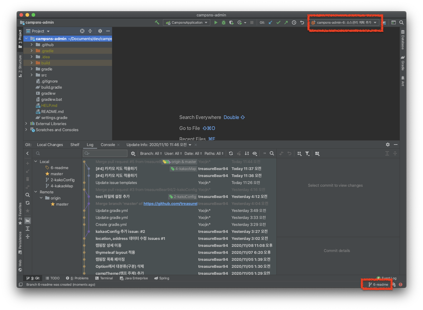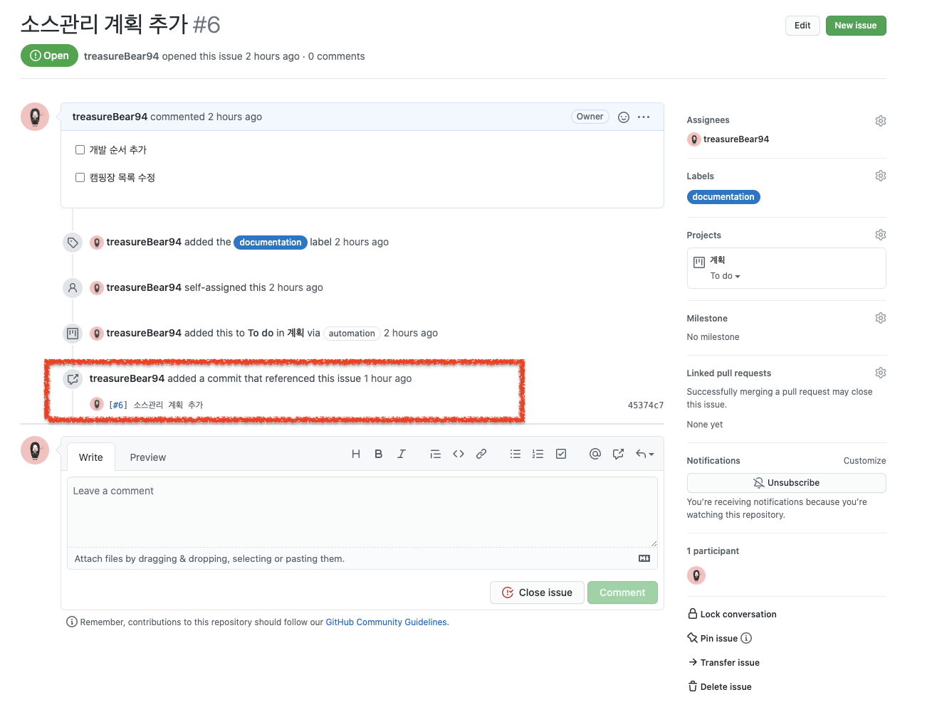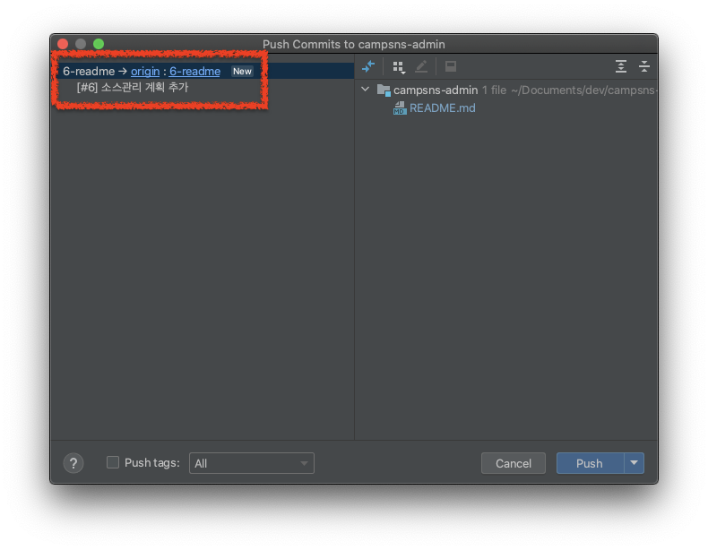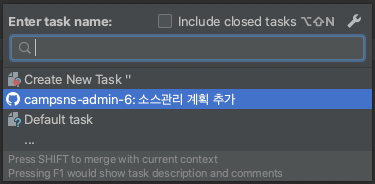 "campsns-admin"은 제 프로젝트 이름이고, "6"은 위에서 본 이슈 번호입니다. "소스관리 계획 추가"는 등록한 이슈 제목입니다.