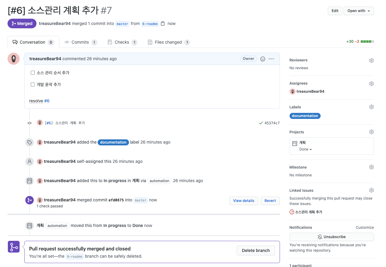 - Merge 하기, 해당 이슈의 branch 삭제하기
