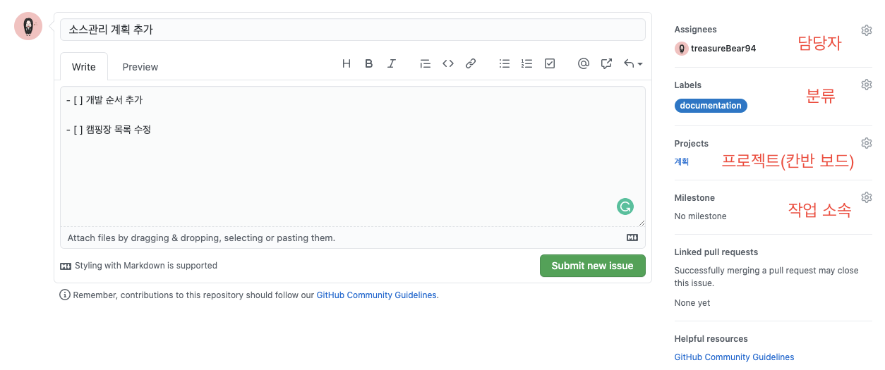 Projects 와 Milestone 은 미리 등록해놓아야 설정 가능합니다. Labels은 이미 등록된 내용을 써도 좋고, 추가도 가능합니다.