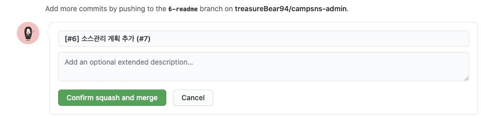 저희는 깔끔하게 Squash and merge 를 선택합니다.