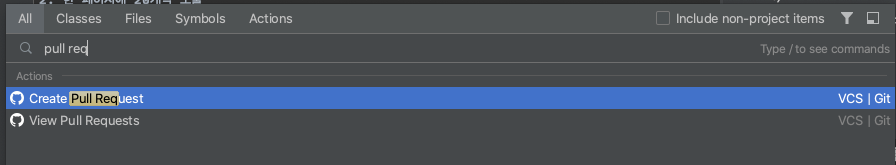 IntelliJ에서 shift 두번 눌러 pull request를 검색해, [ Create Pull Request ] 를 선택합니다.