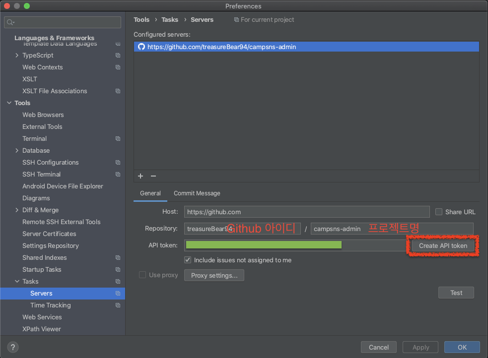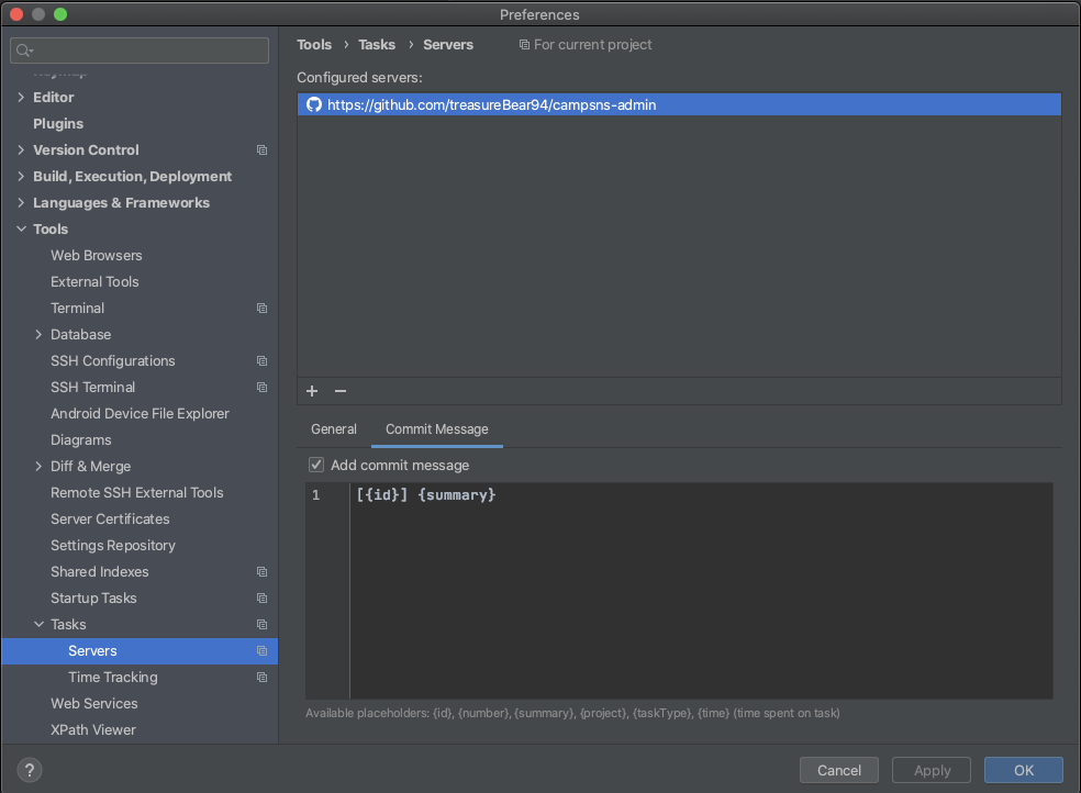 [Preferences...] -> [Tools] -> [Tasks] -> [Servers] 에서 [+] 를 클릭해 Github을 등록해줍니다.