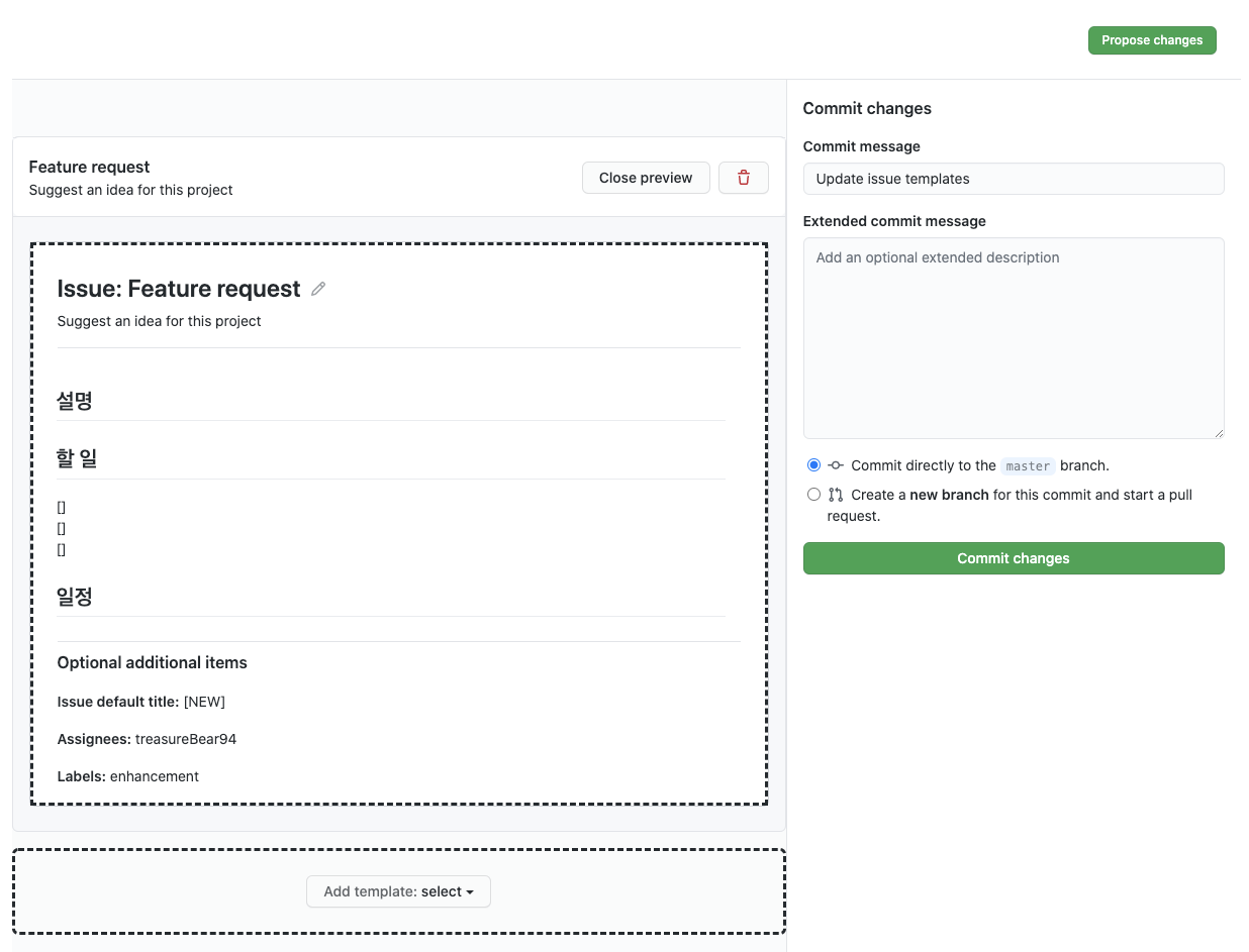 수정 후, [Propose changes] 를 클릭 후, 커밋합니다.