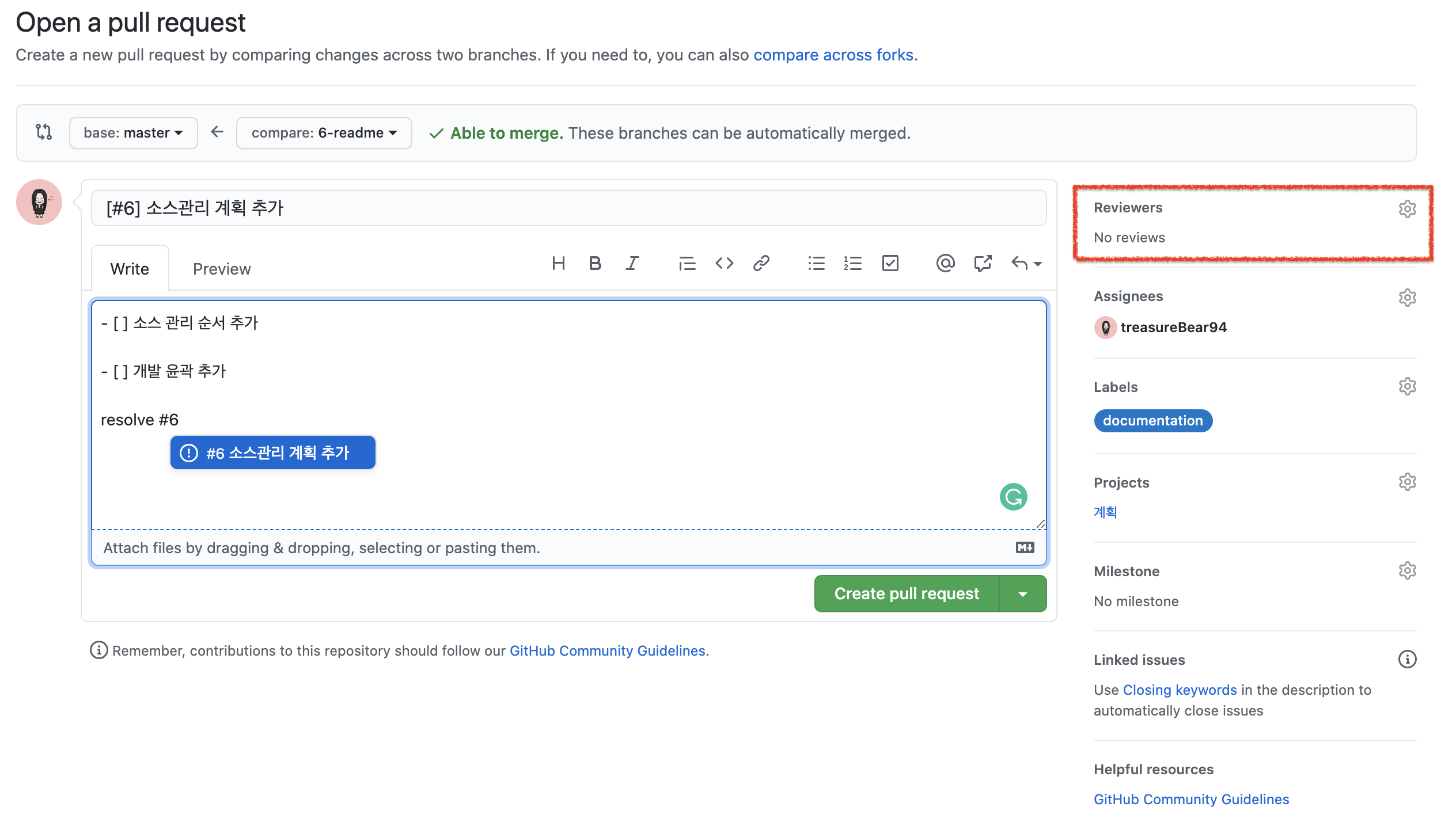 pull request도 이슈처럼 내용을 작성해주고 Assignees, labels, projects, milestone 를 넣어줄 수 있습니다.