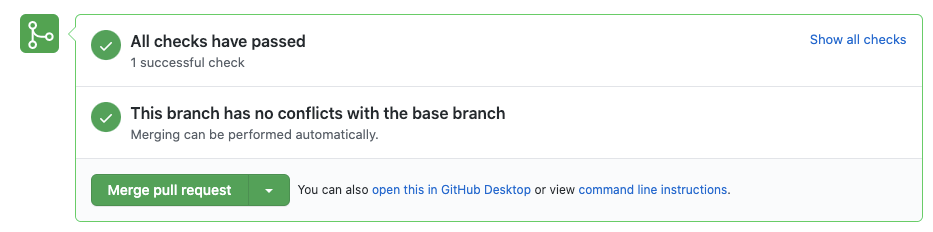 테스트도 잘 마치면, 아래와 같이 Merge pull request 버튼이 초록색으로 활성화됩니다.