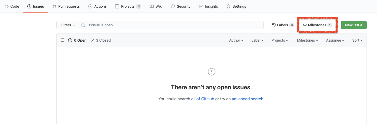 마일스톤은 이슈 탭 마일스톤에서 만들 수 있습니다.