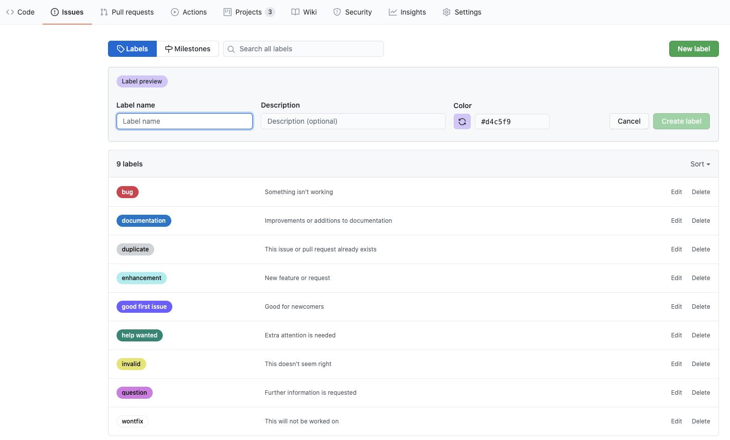 Label은 이슈 탭에서 New label을 눌러 새로 등록이 가능 합니다. Label을 통한 필터 검색이 가능합니다.