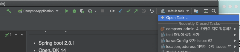 인텔리제이 우상단 Default task 영역을 클릭 후, Open Task...를 클릭합니다.