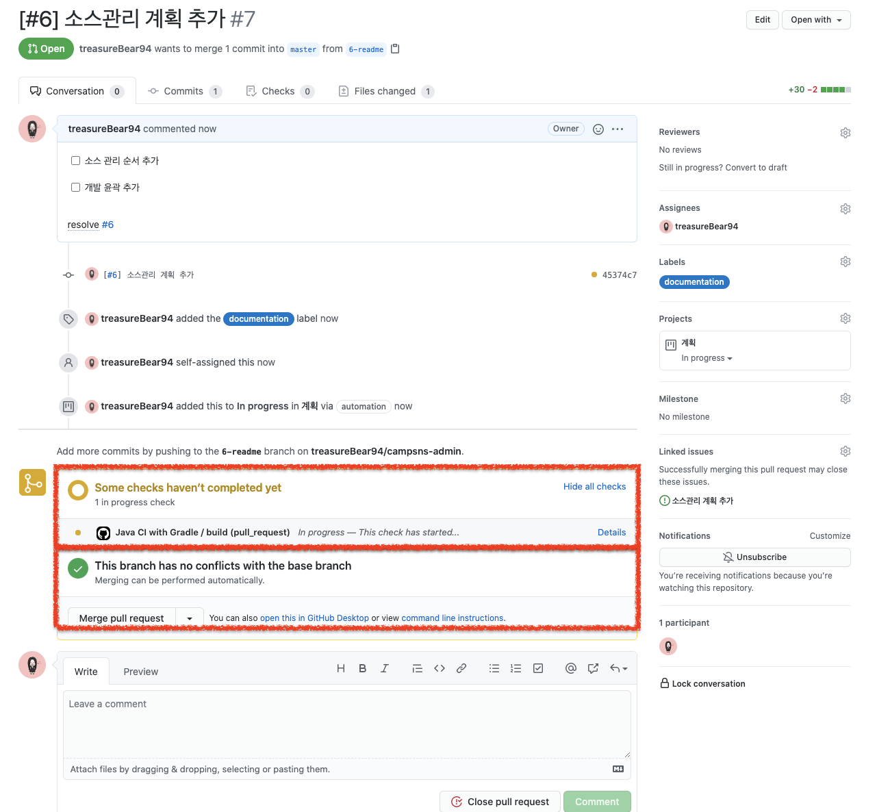 아래와 같이 pull request가 등록되었습니다.
