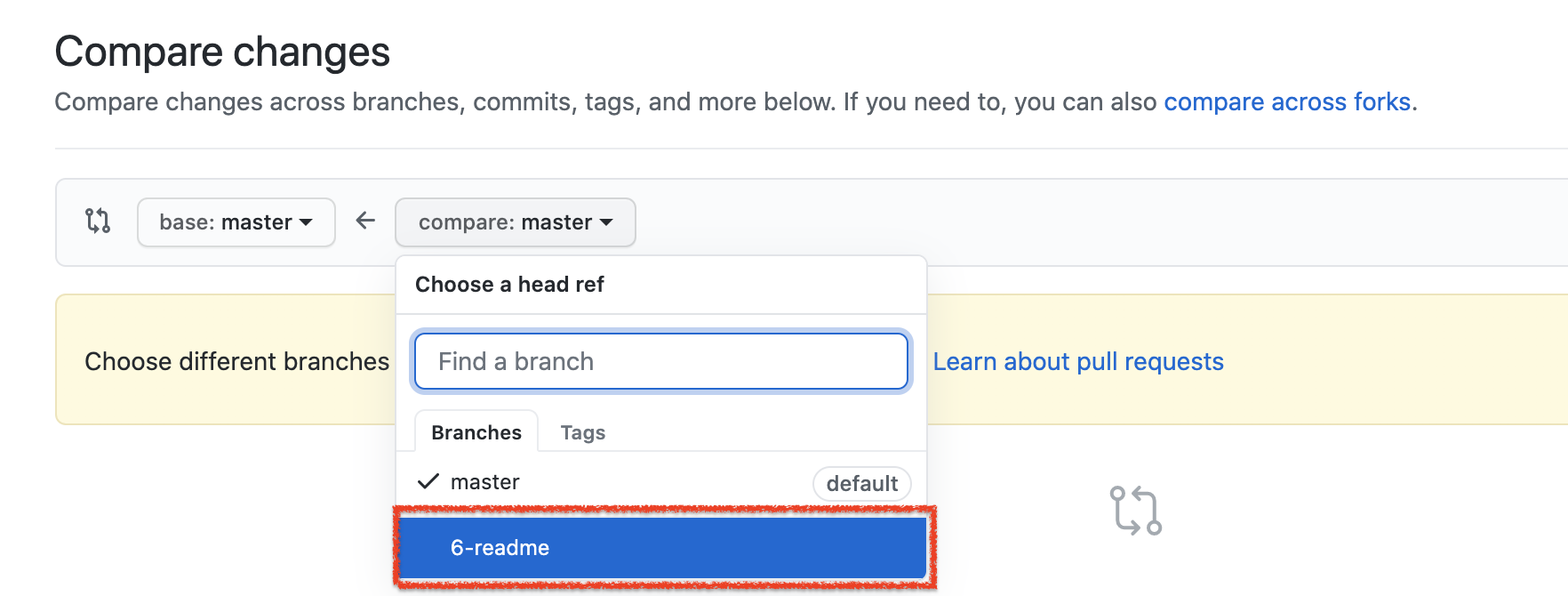 compare 에 push한 브랜치를 선택해줍니다.